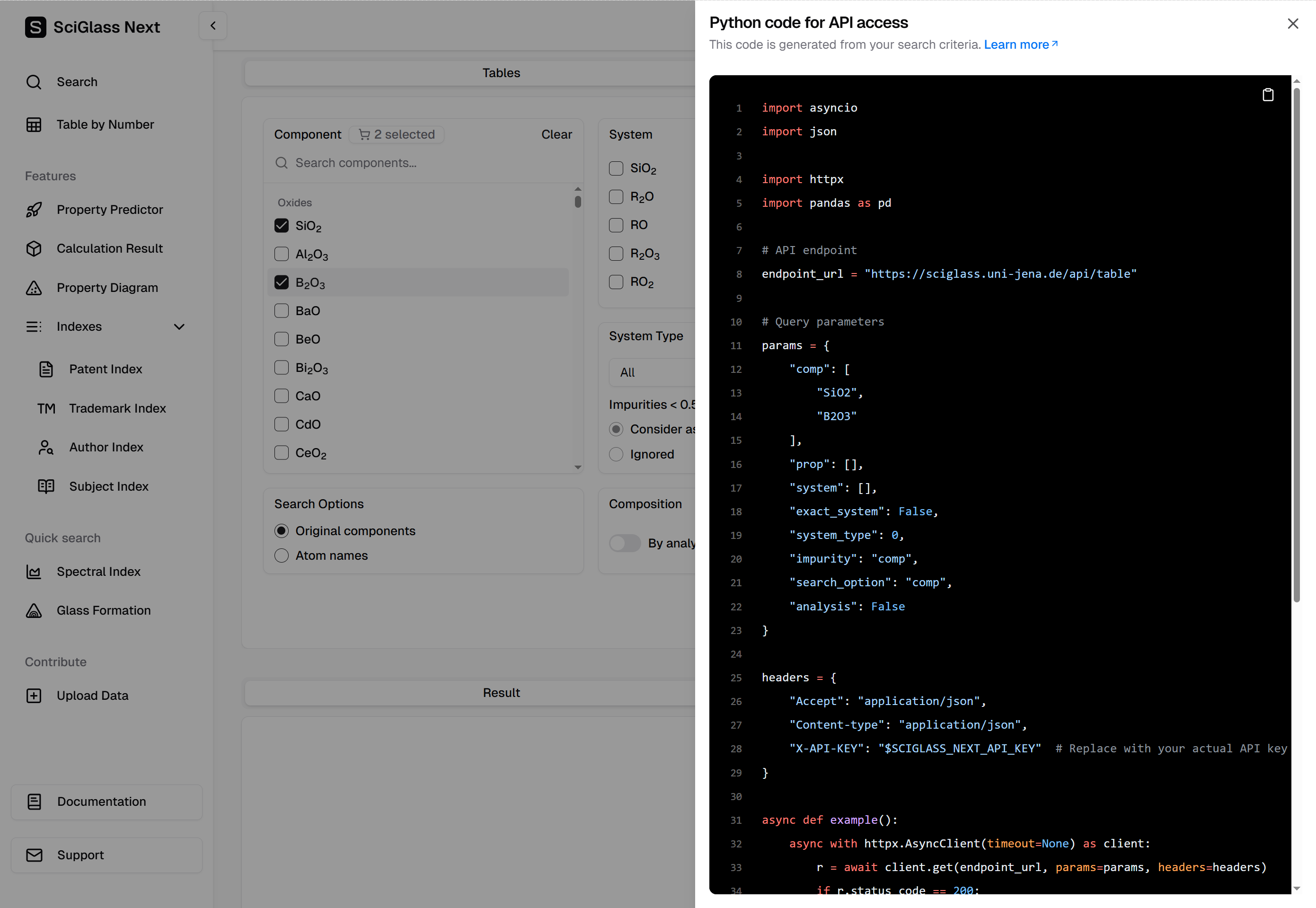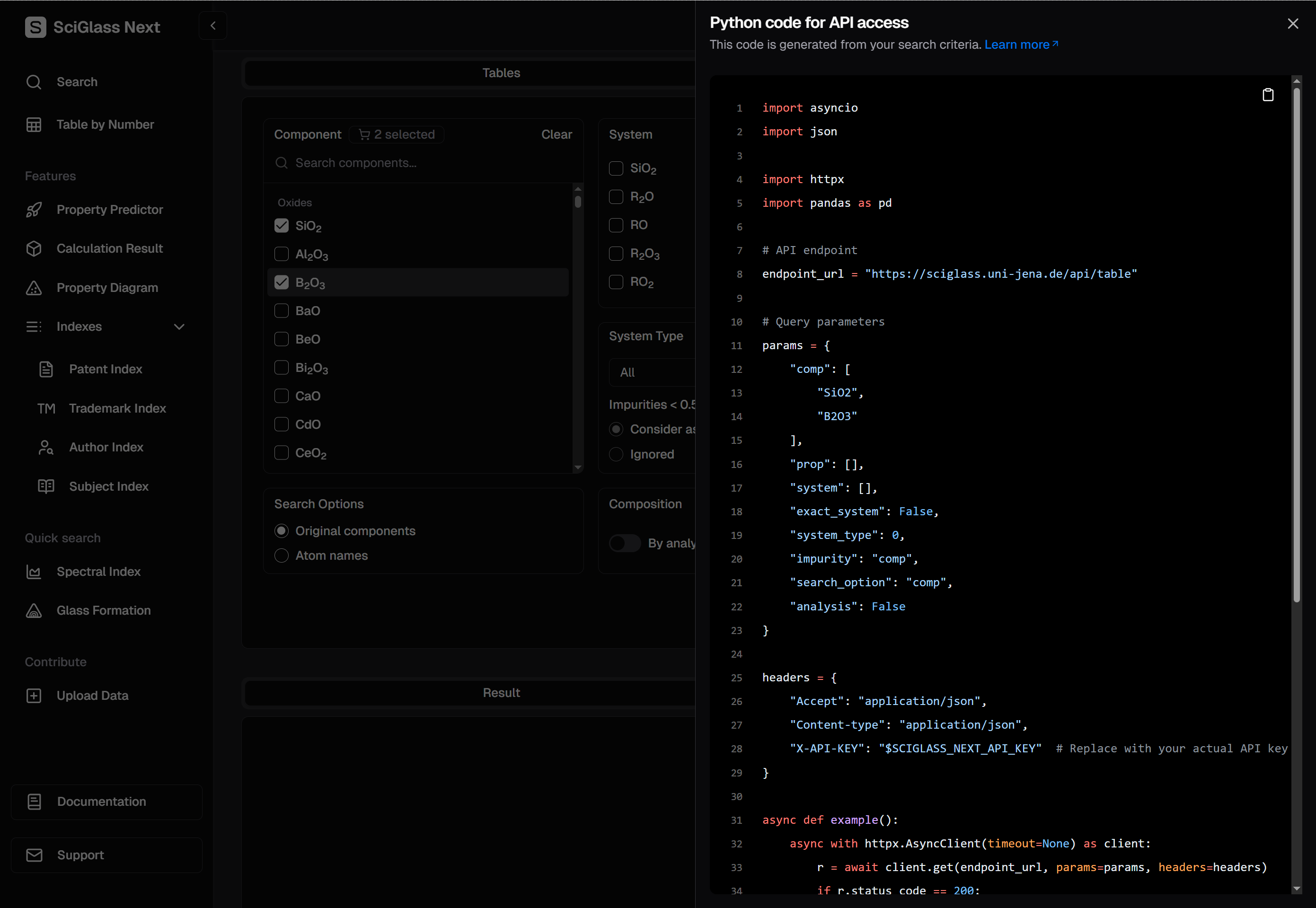 The Python code snippet is automatically generated based on the search you have entered. You can copy this code and paste it into your Python environment to directly fetch data.
