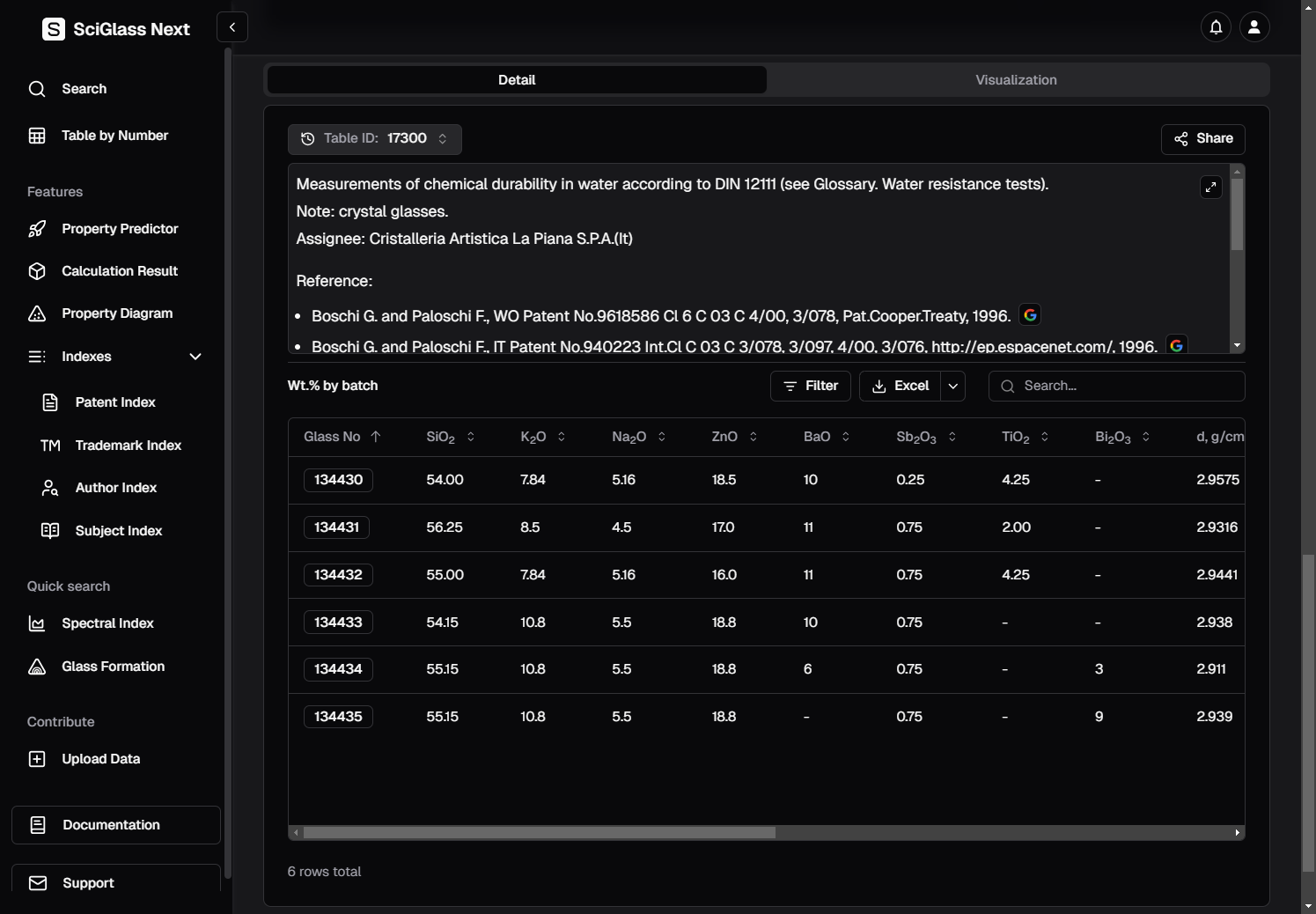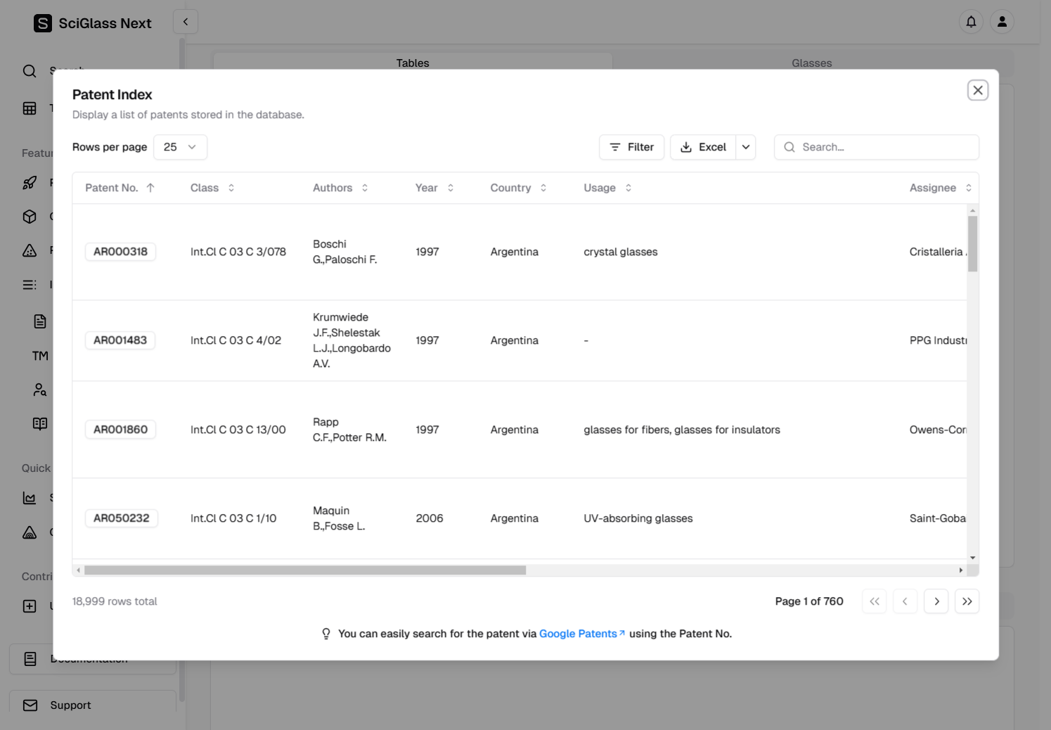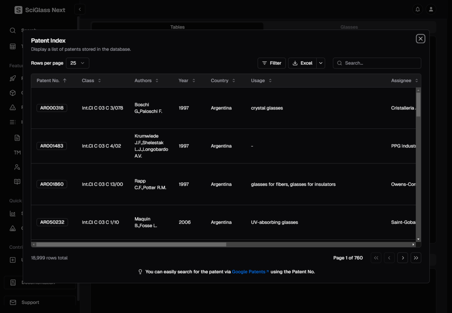 The Patent index window displays a list of patents stored in the SciGlass database and enables to perform the patent search with details specified by the columns containing Patent No., Authors, Year, Country, Assignee, Notes, Components, and Properties.