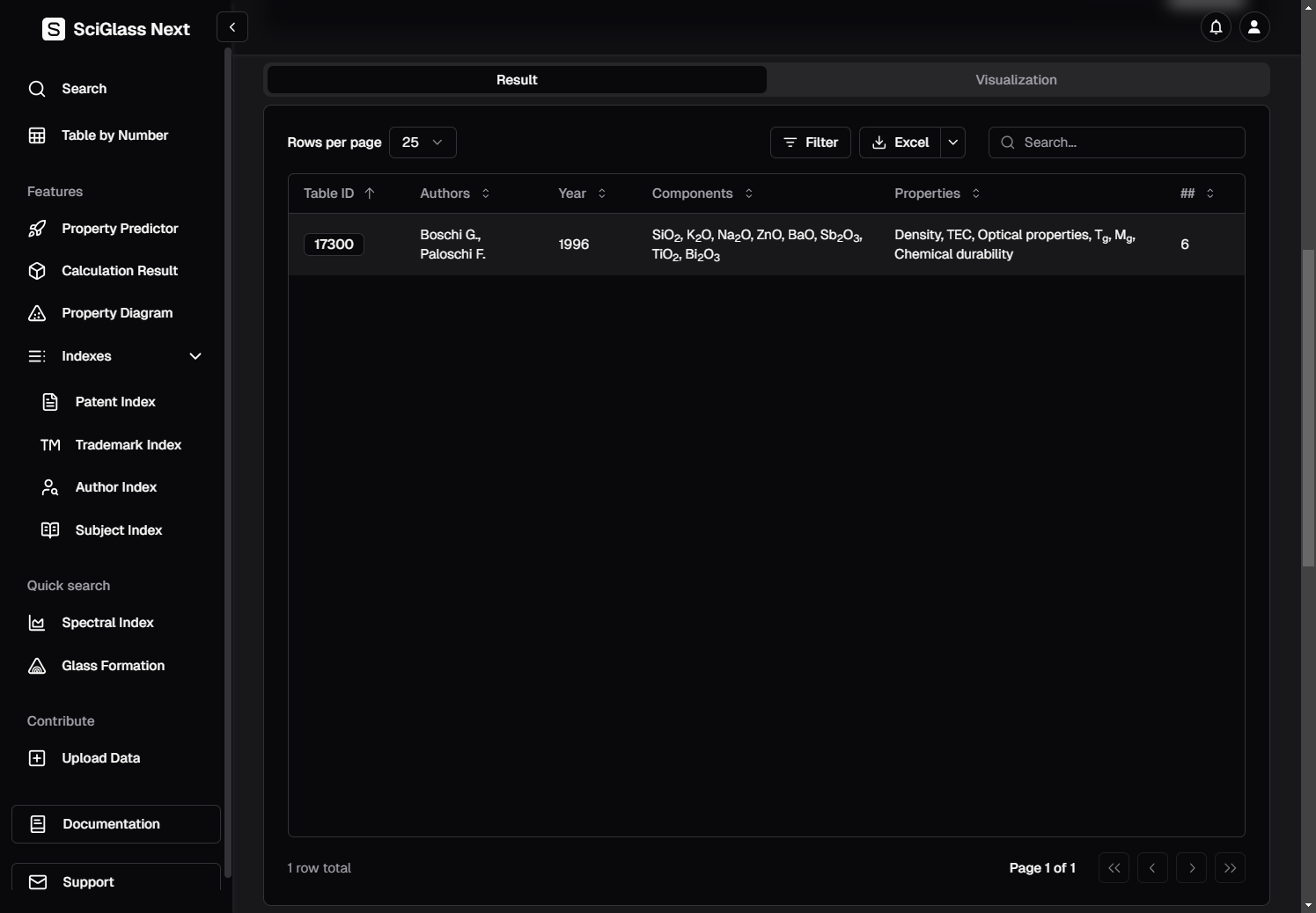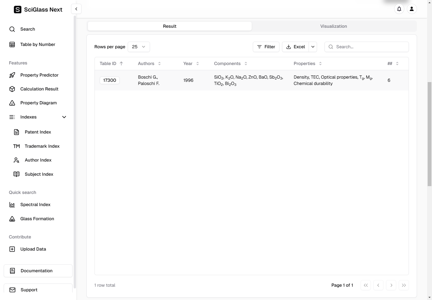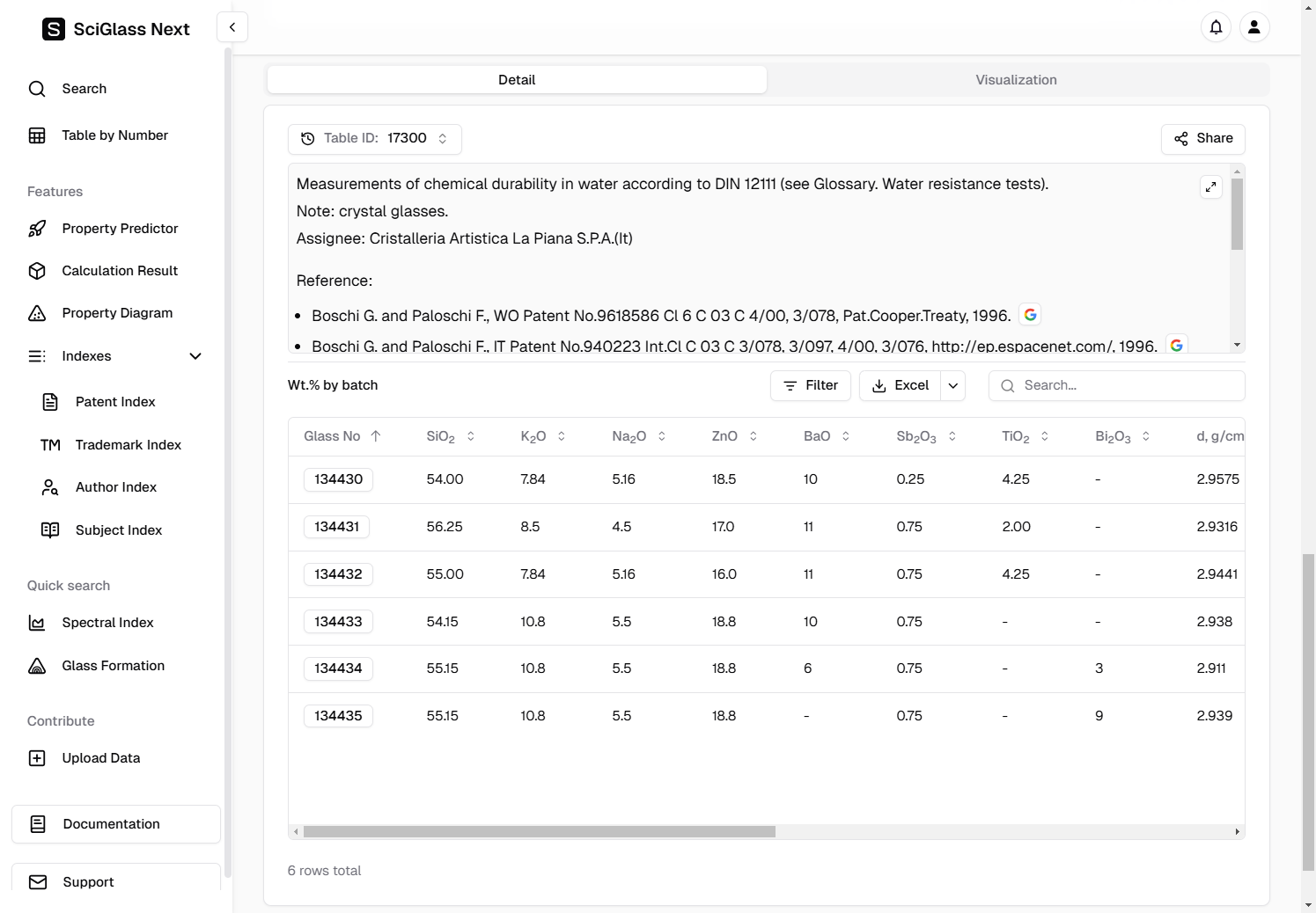 The Patent index window displays a list of patents stored in the SciGlass database and enables to perform the patent search with details specified by the columns containing Patent No., Authors, Year, Country, Assignee, Notes, Components, and Properties.