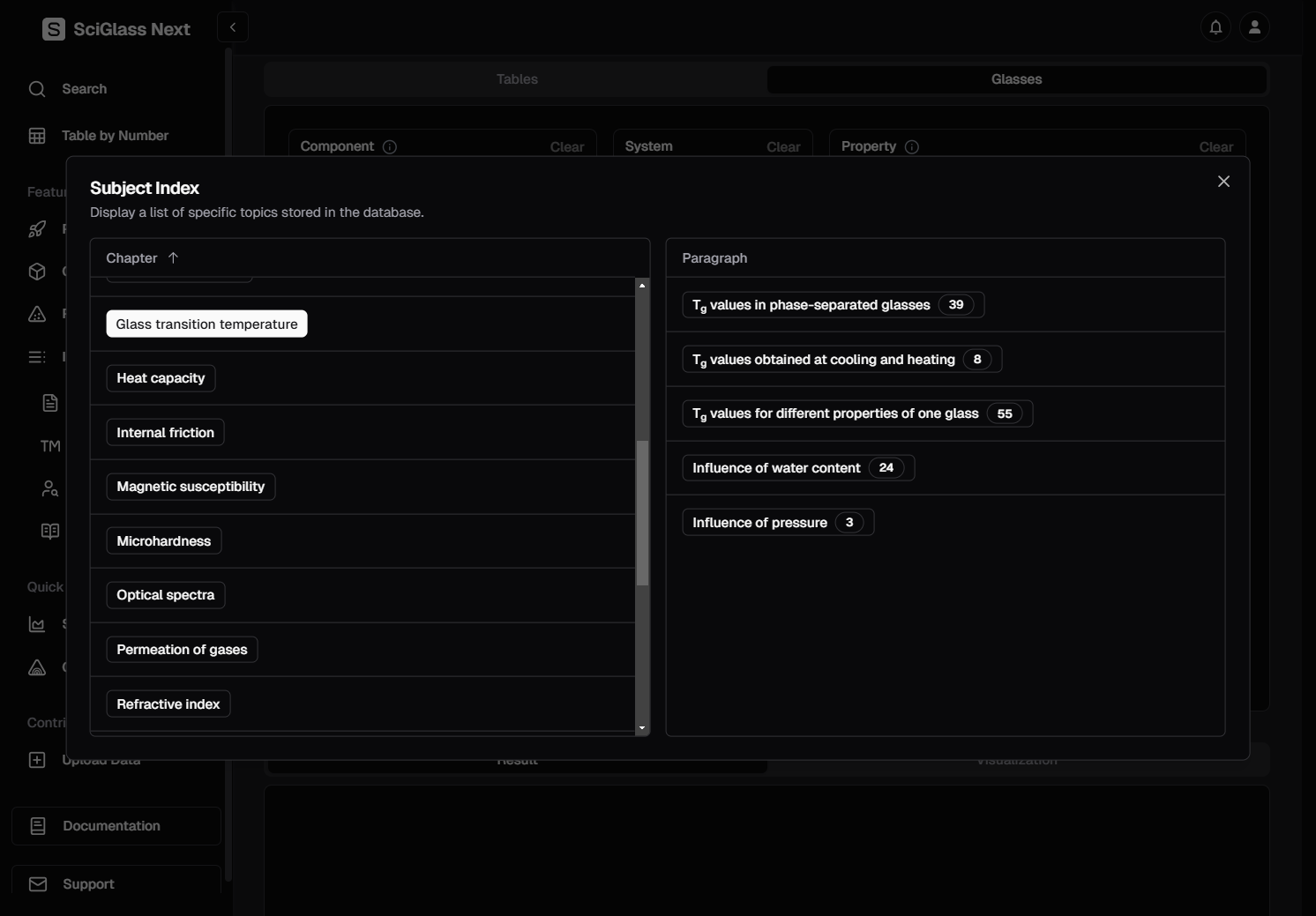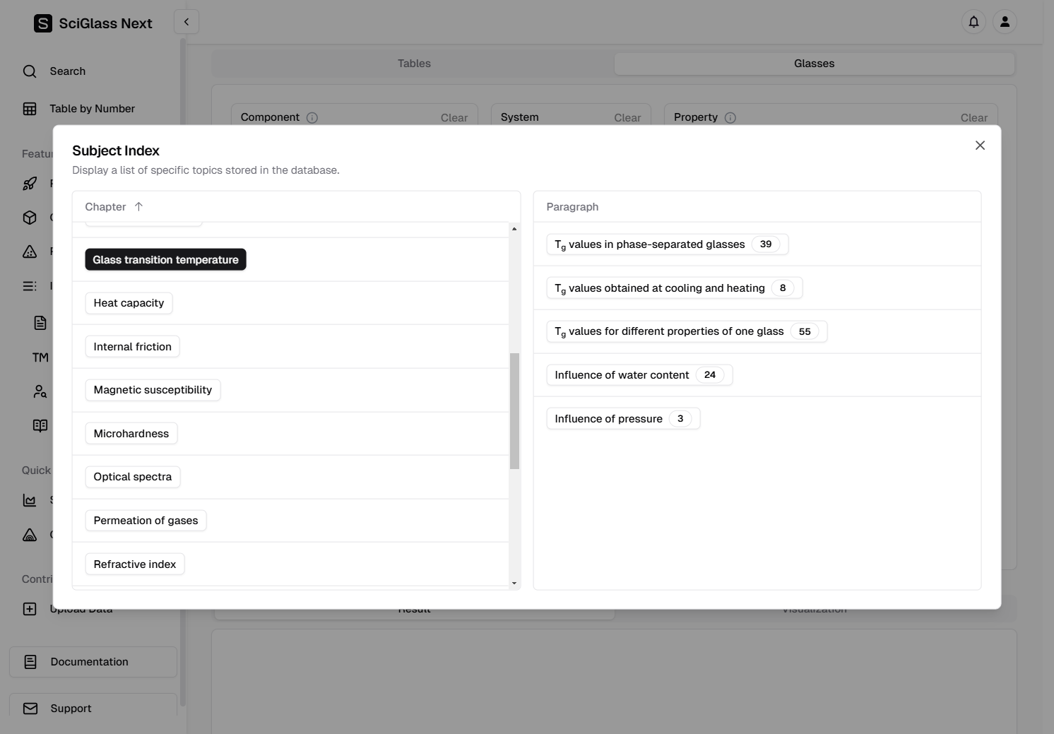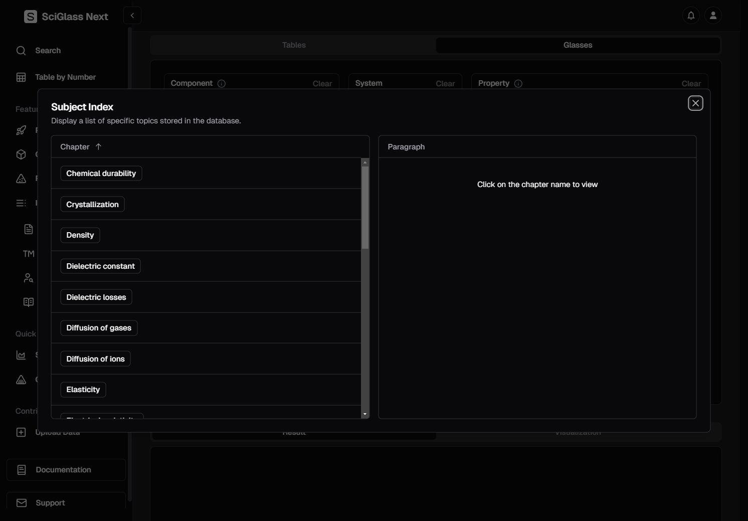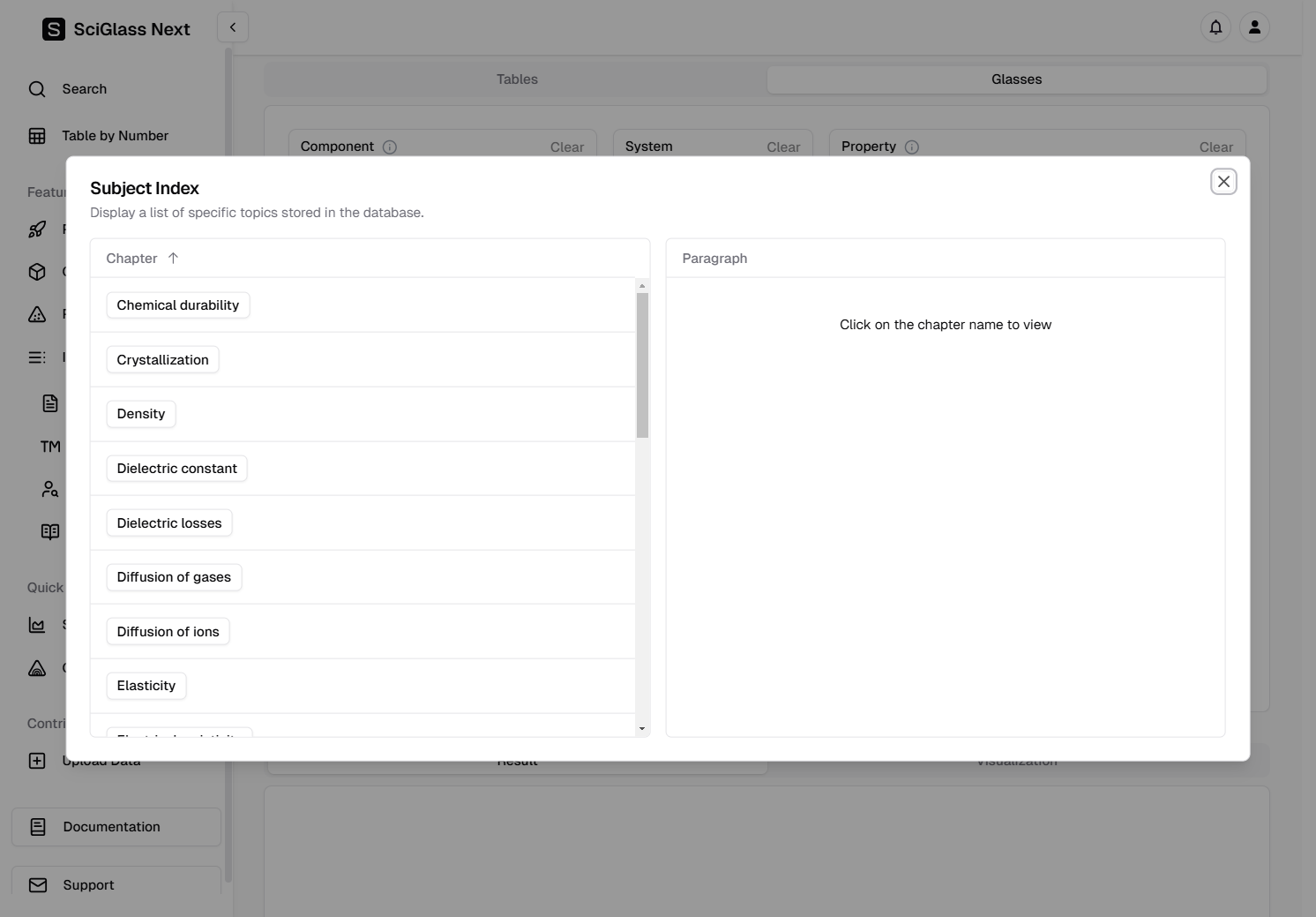 - The window contains two parts side by side: the left-hand side displays the list of arranged chapters in the SciGlass database.