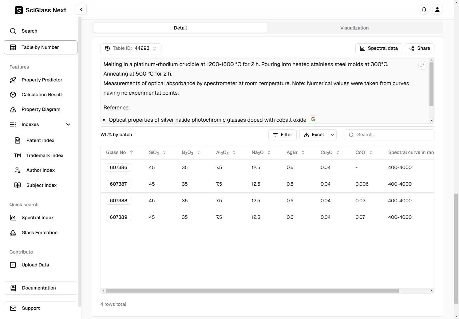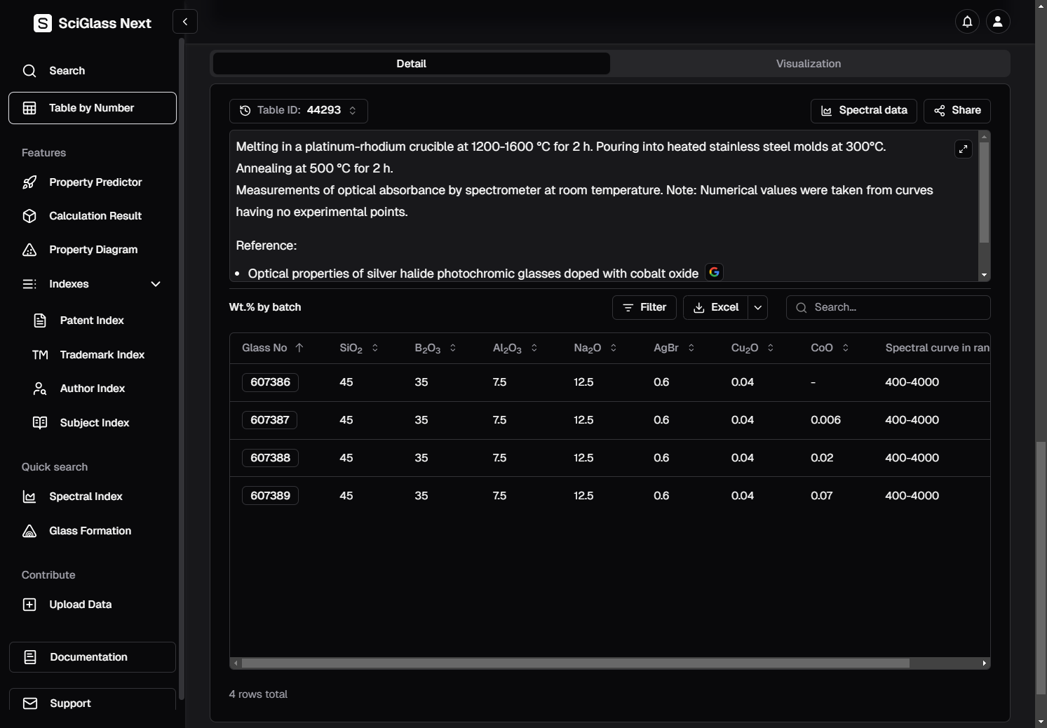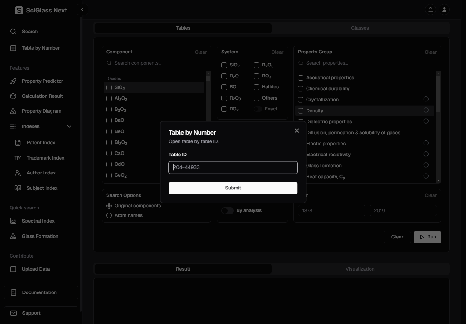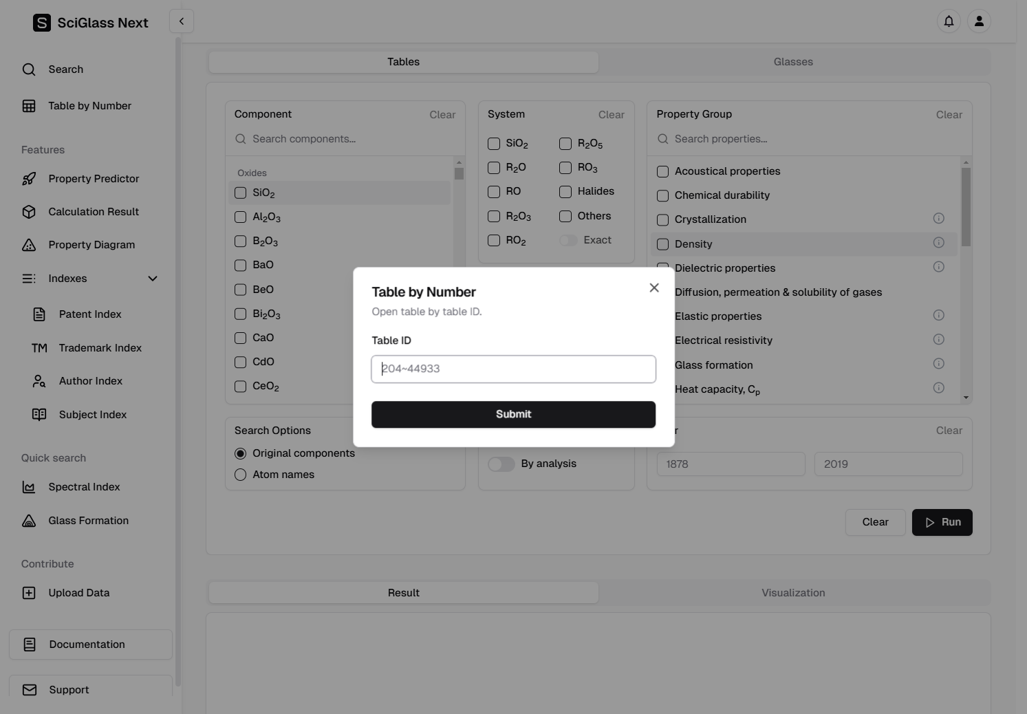 The able by number window allows the user to quickly open the table via the table ID (a unique identifier used in the SciGlass database).