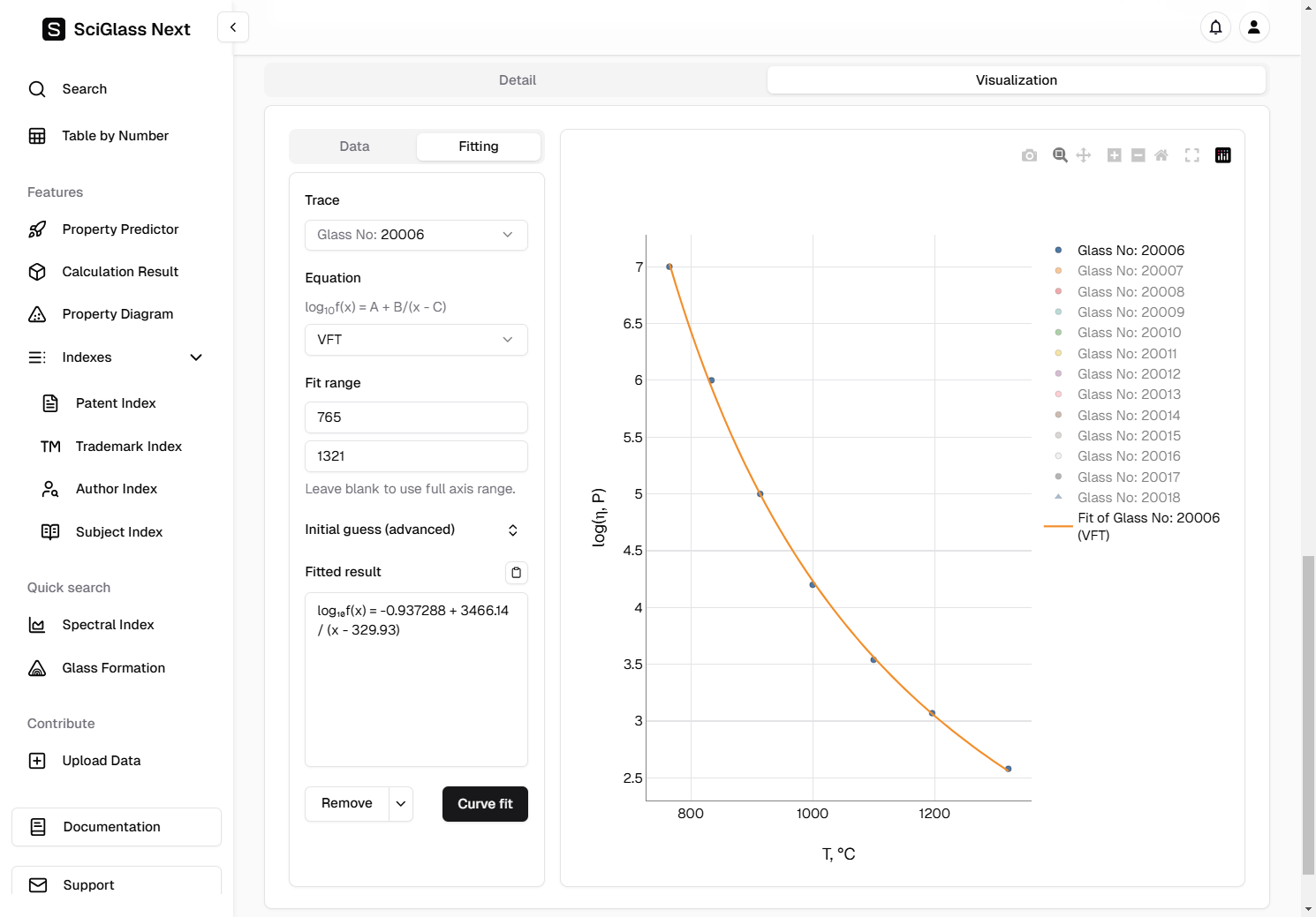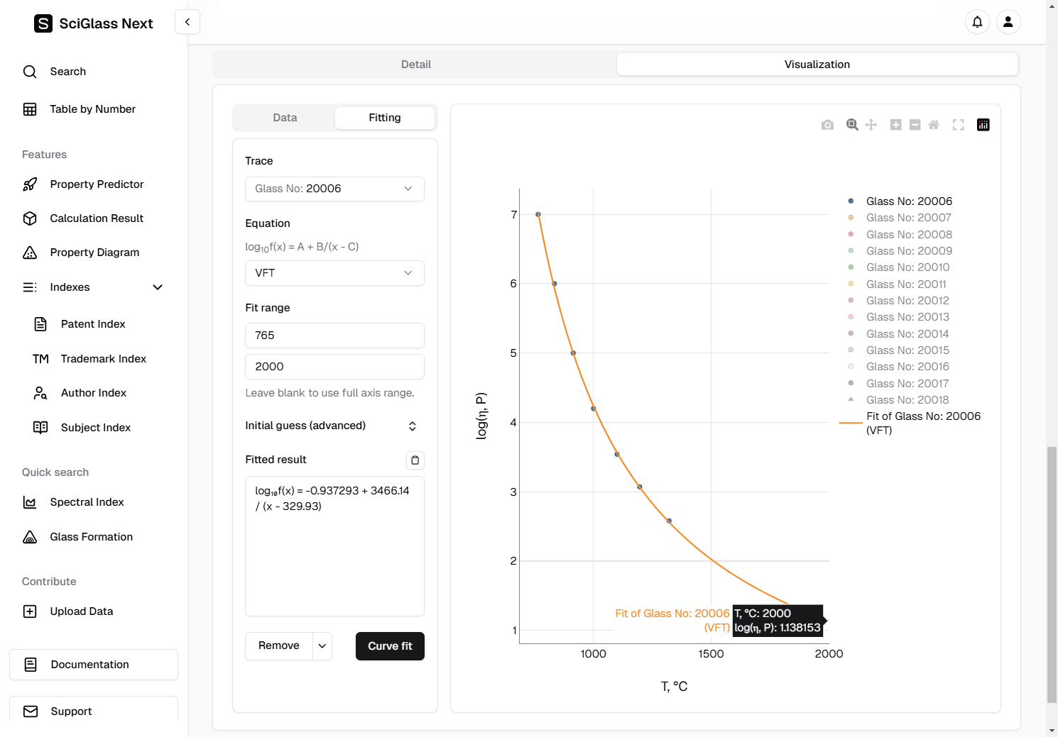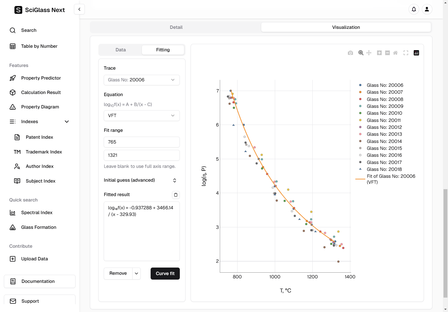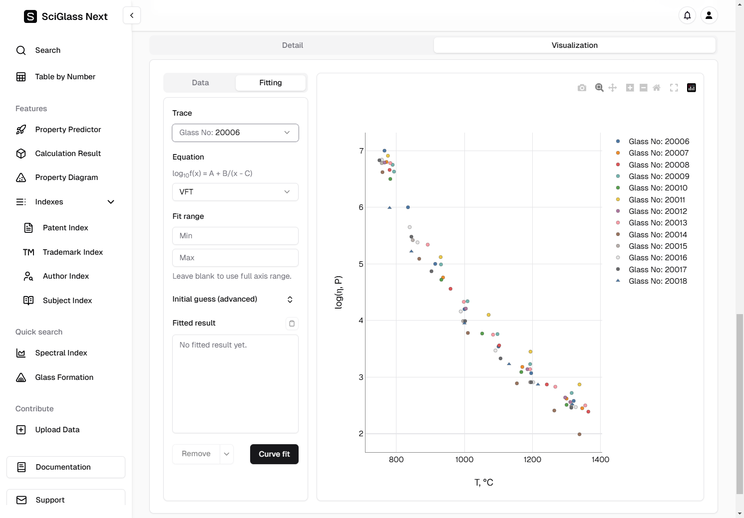 Again, let's use the trace Glass No: 20006 as an example, and since we already know that we are dealing with viscosity data, we choose the equation VFT for fitting.
