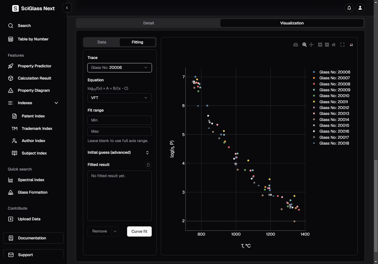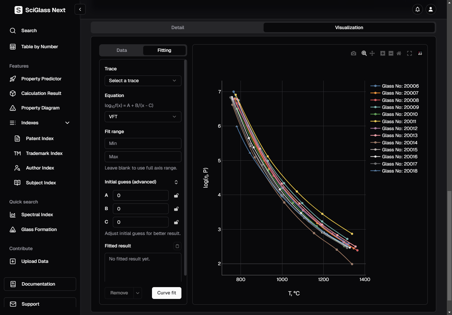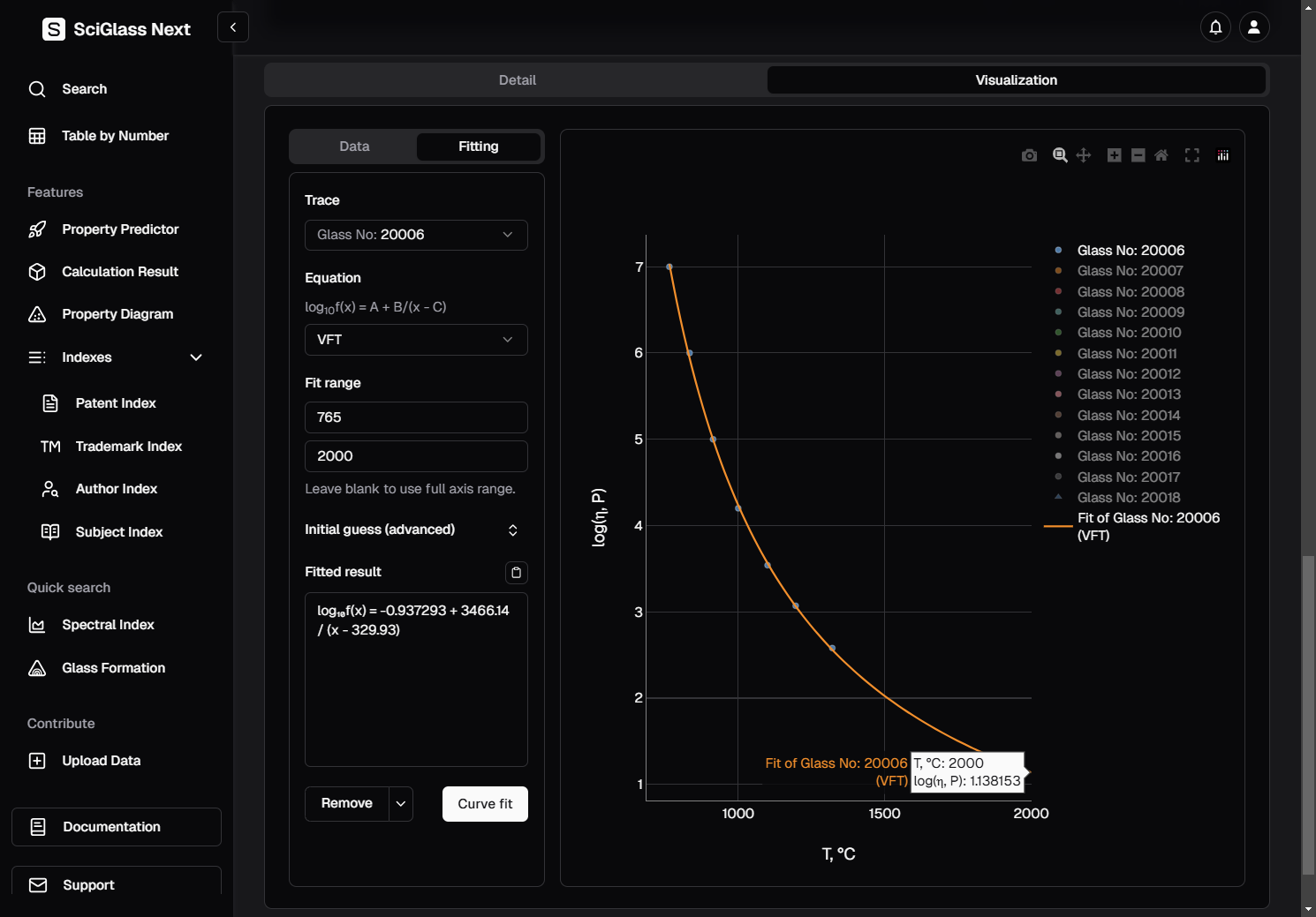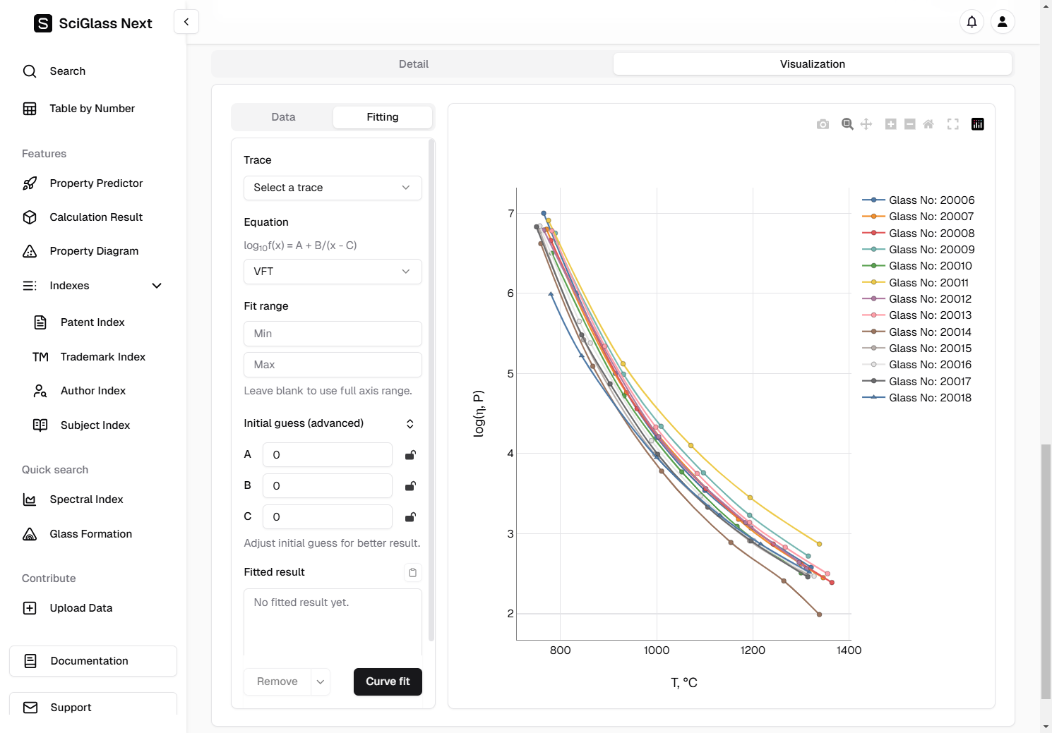 Again, let's use the trace Glass No: 20006 as an example, and since we already know that we are dealing with viscosity data, we choose the equation VFT for fitting.