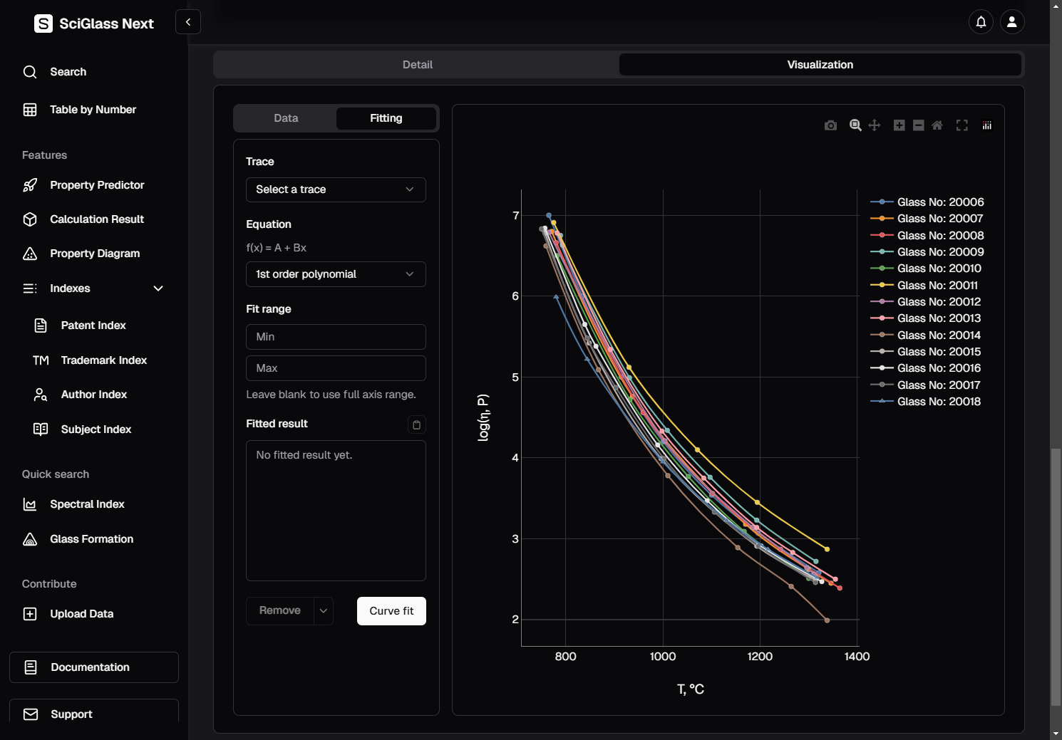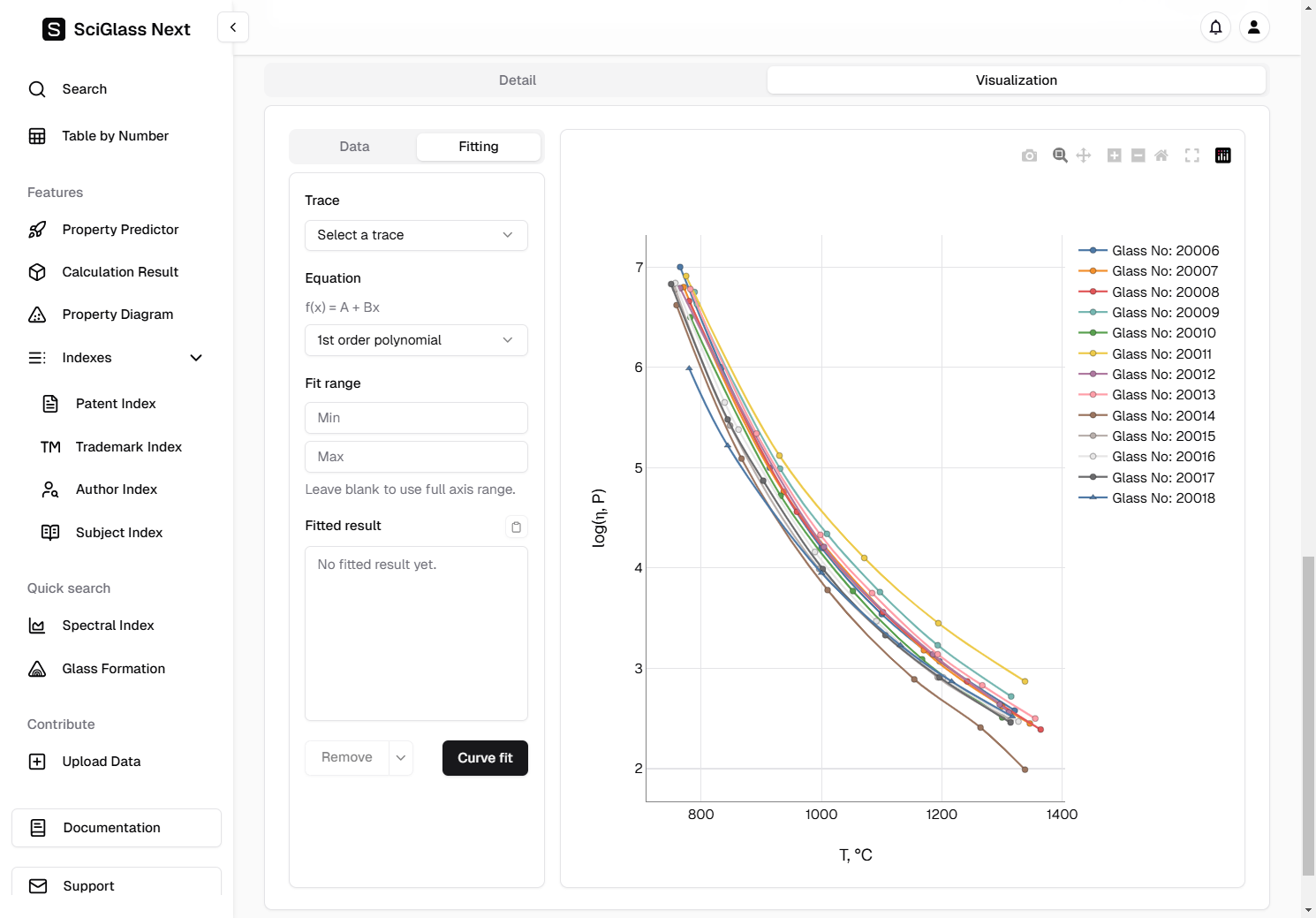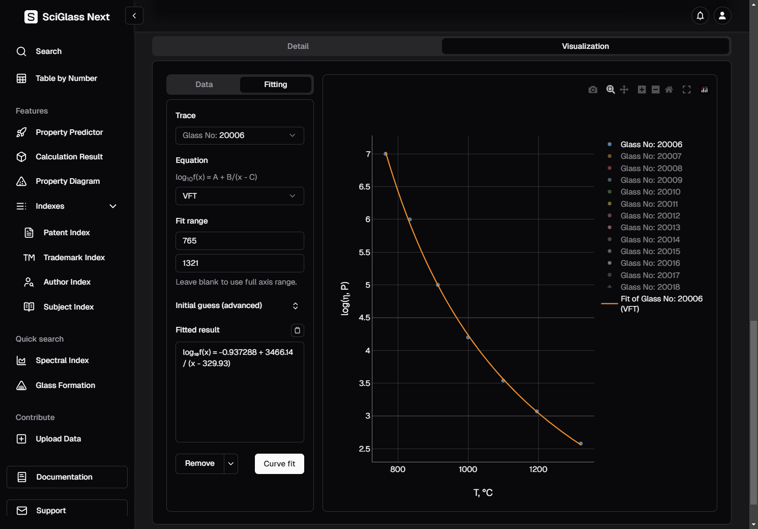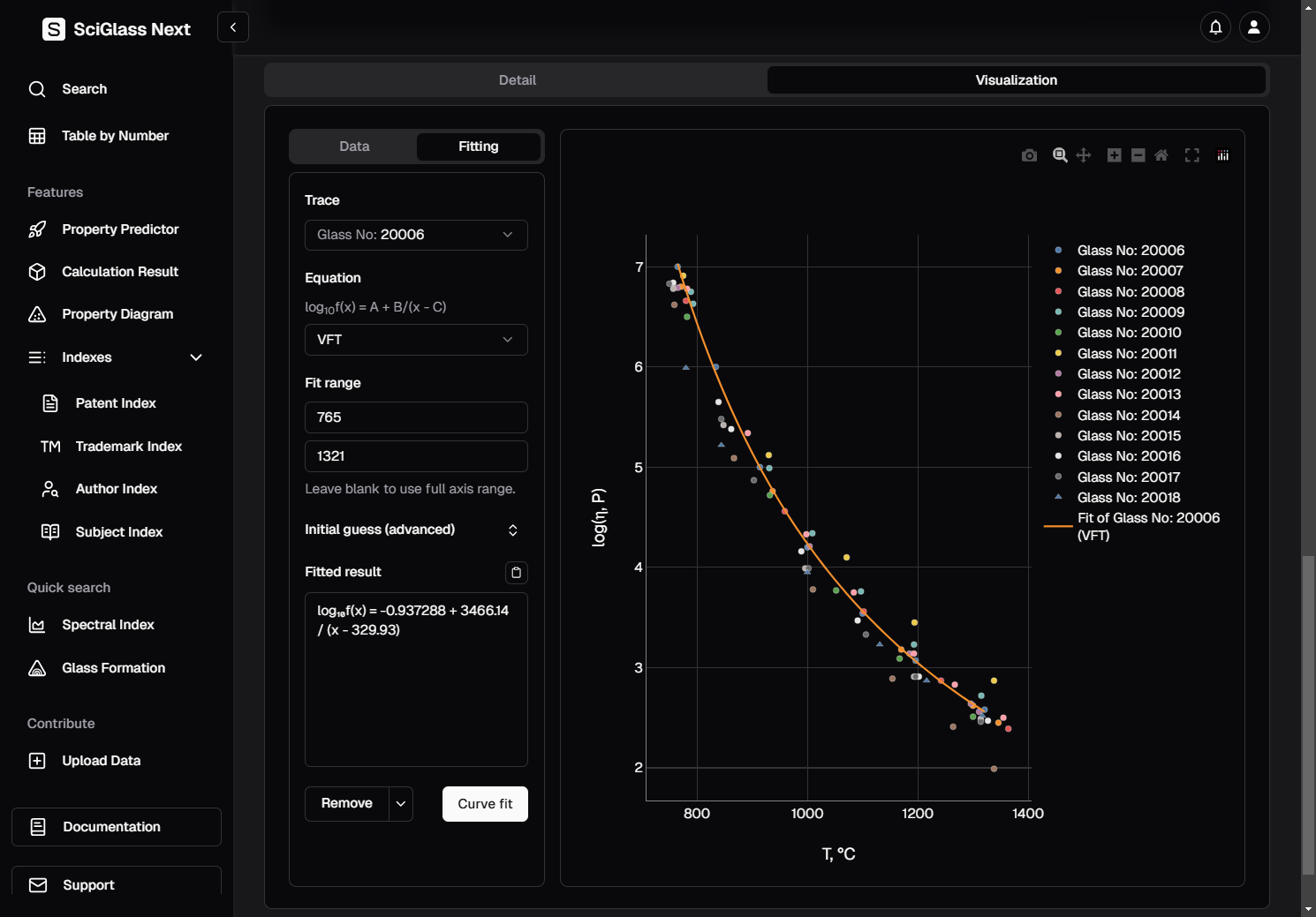 Again, let's use the trace Glass No: 20006 as an example, and since we already know that we are dealing with viscosity data, we choose the equation VFT for fitting.