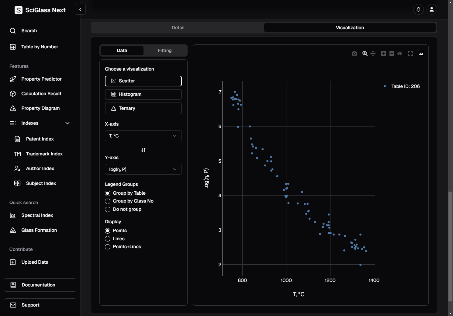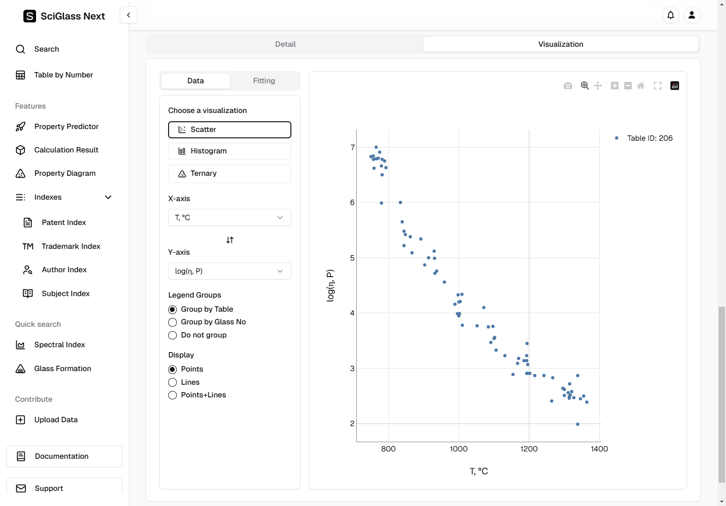 For example, open a table with ID: 206 (it contains viscosity data), choose the Scatter chart type (default).