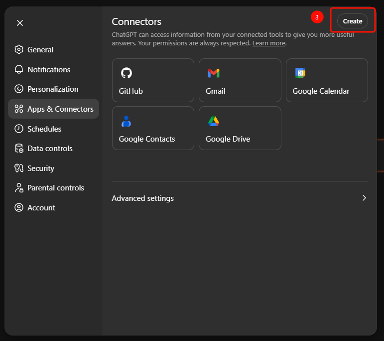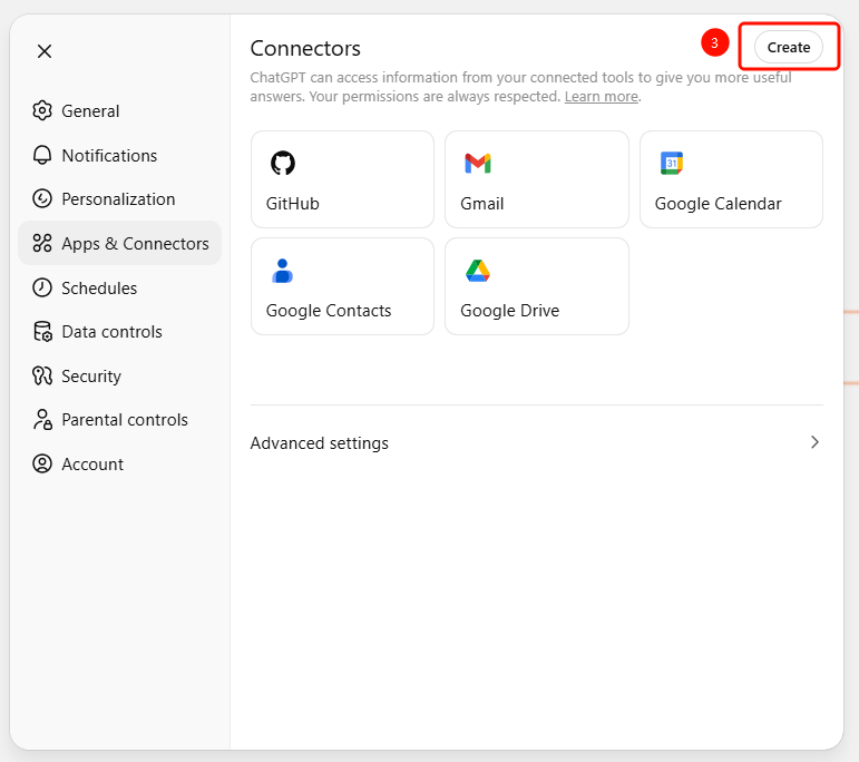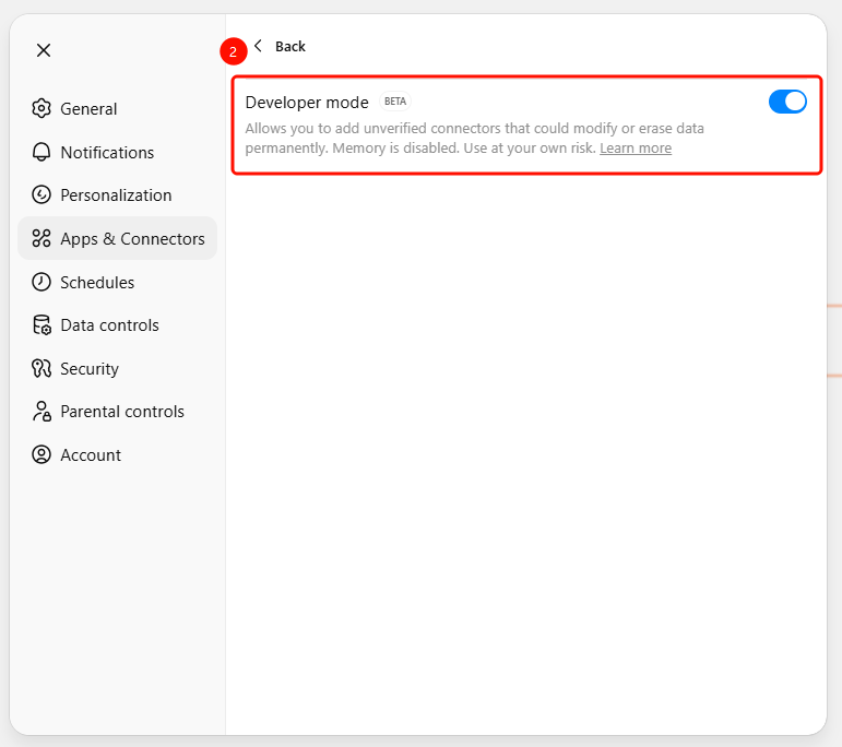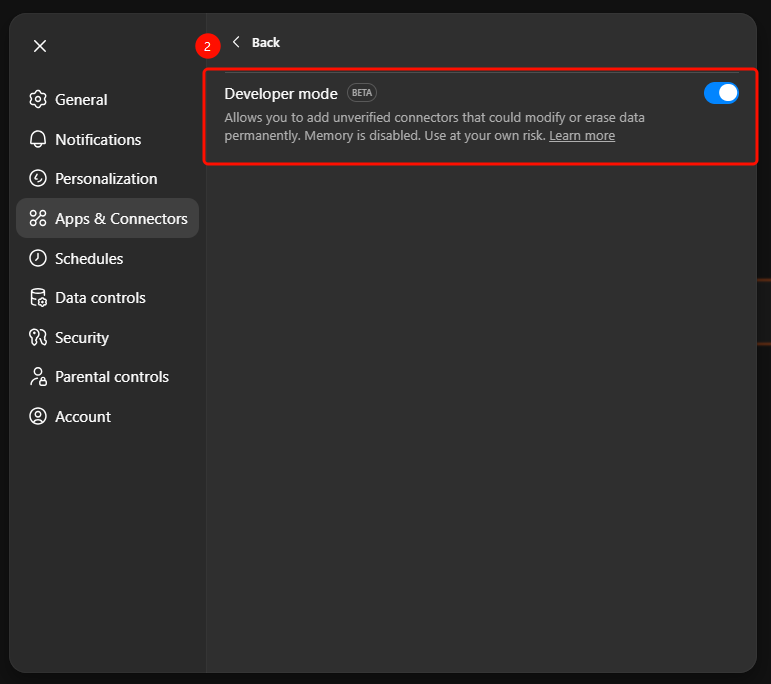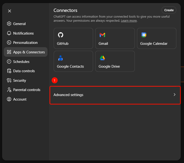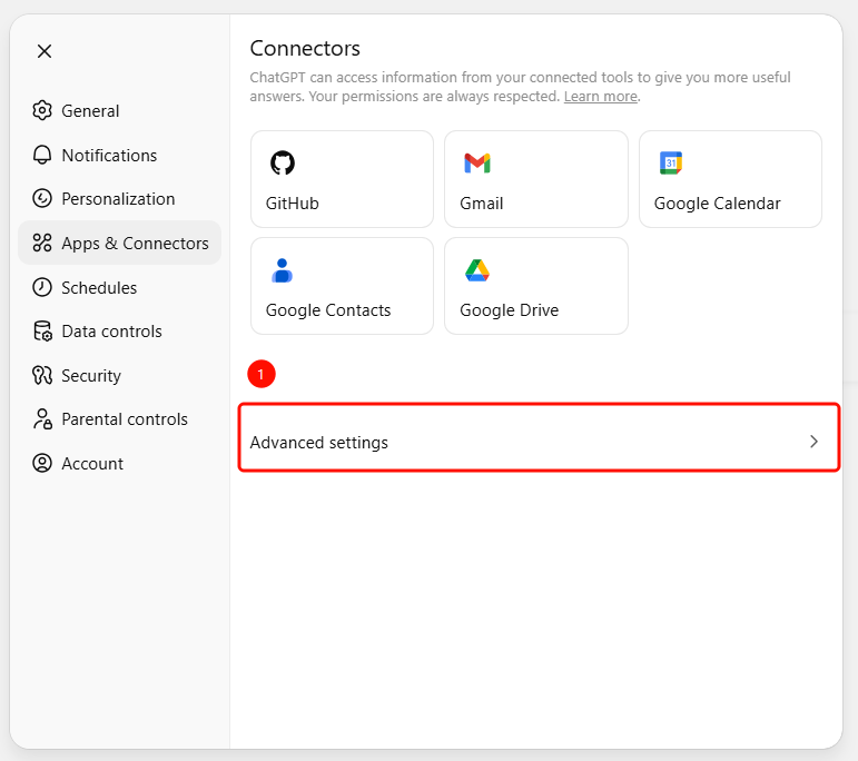 Navigate to Settings → Apps & Connectors → Advanced Settings to toggle.