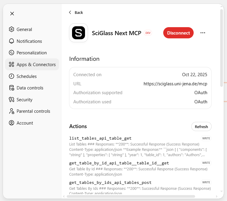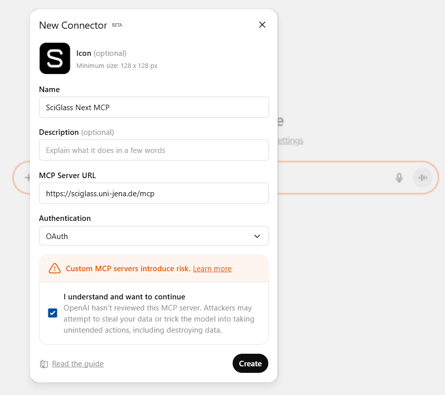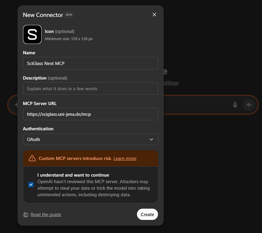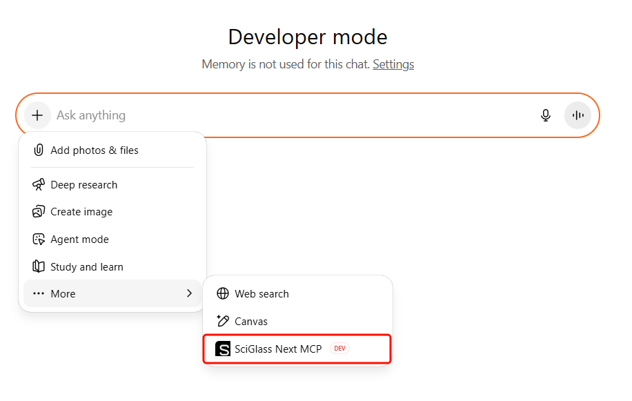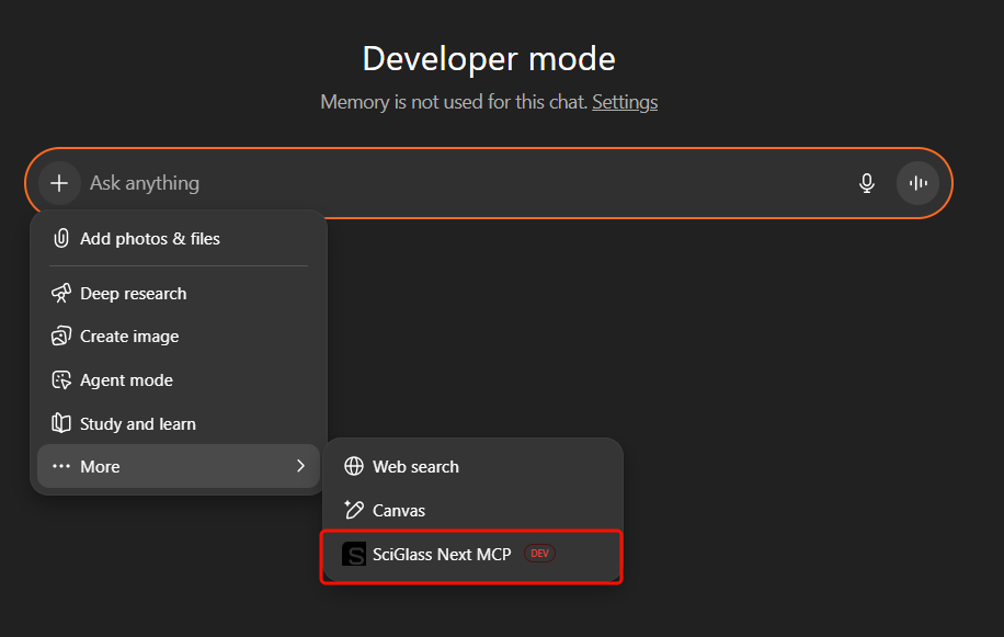 You can connect SciGlass Next MCP to ChatGPT web if developer mode is enabled (available for ChatGPT Plus plan and above). Once Developer Mode is enabled, you can add the SciGlass Next MCP server following the in-app instructions.