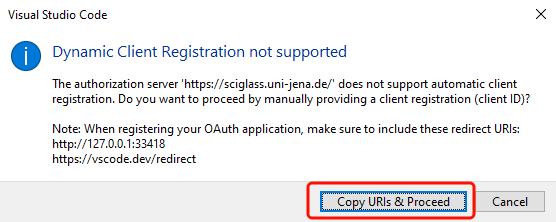 You'll be prompted to manually enter the client ID. Click Copy URIs & Proceed.