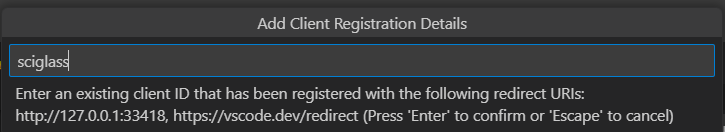 And then type sciglass and press Enter to proceed. Leave the client secret blank. Press Enter again,
